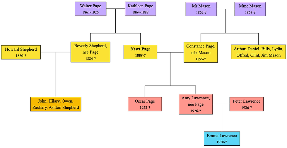 Newt Page est né le 26 septembre 1888 à Leatherhead, une ville dans le comté du Surrey, en Angleterre. Il aurait pu vivre une enfance heureuse si sa mère n'était pas décédée peu de temps après sa naissance. Cette perte affecta considérablement son père, Walter Page, qui devint d'autant plus dur par la suite. Dès que le jeune Newt eut atteint l'âge de 4-5 ans, il ne passait plus son temps à jouer, mais à travailler. Travailler dur, sous la contrainte de son père. Ce dernier usait souvent de la force pour faire travailler son fils, qui voulait tout naturellement passer plus de temps à s'amuser. Alors, il l'enfermait dans sa chambre jusqu'à ce qu'il ait appris sa leçon, jusqu'à ce qu'il parvienne à écrire correctement. Cela se terminait généralement en pleurs et en cris, Newt tapant des poings contre la porte fermée, avant de s'effondrer en pleurs.